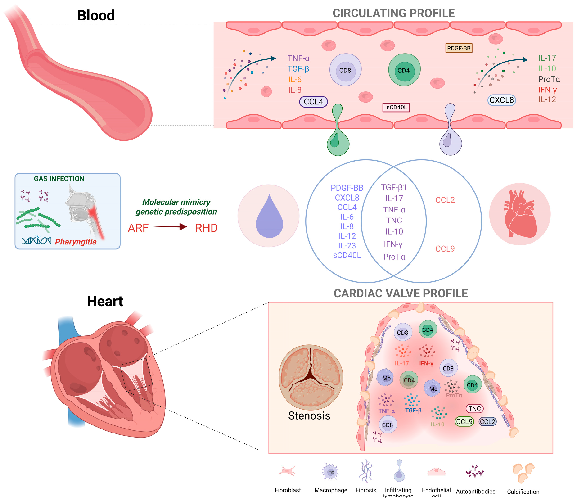 | Cytokines, chemokines and growth factors | CCL5, CXCL8, IL-1ra, IL-4, IL-9, and PDGF-BB levels distinguished clinical RHD from latent disease with 100% sensitivity and specificity; CXCL8, G-CSF, IL-15, IL-1ra, IL-4, and IL-7 levels predicted clinical RHD with 100% sensitivity and specificity compared to healthy controls. | [42] |