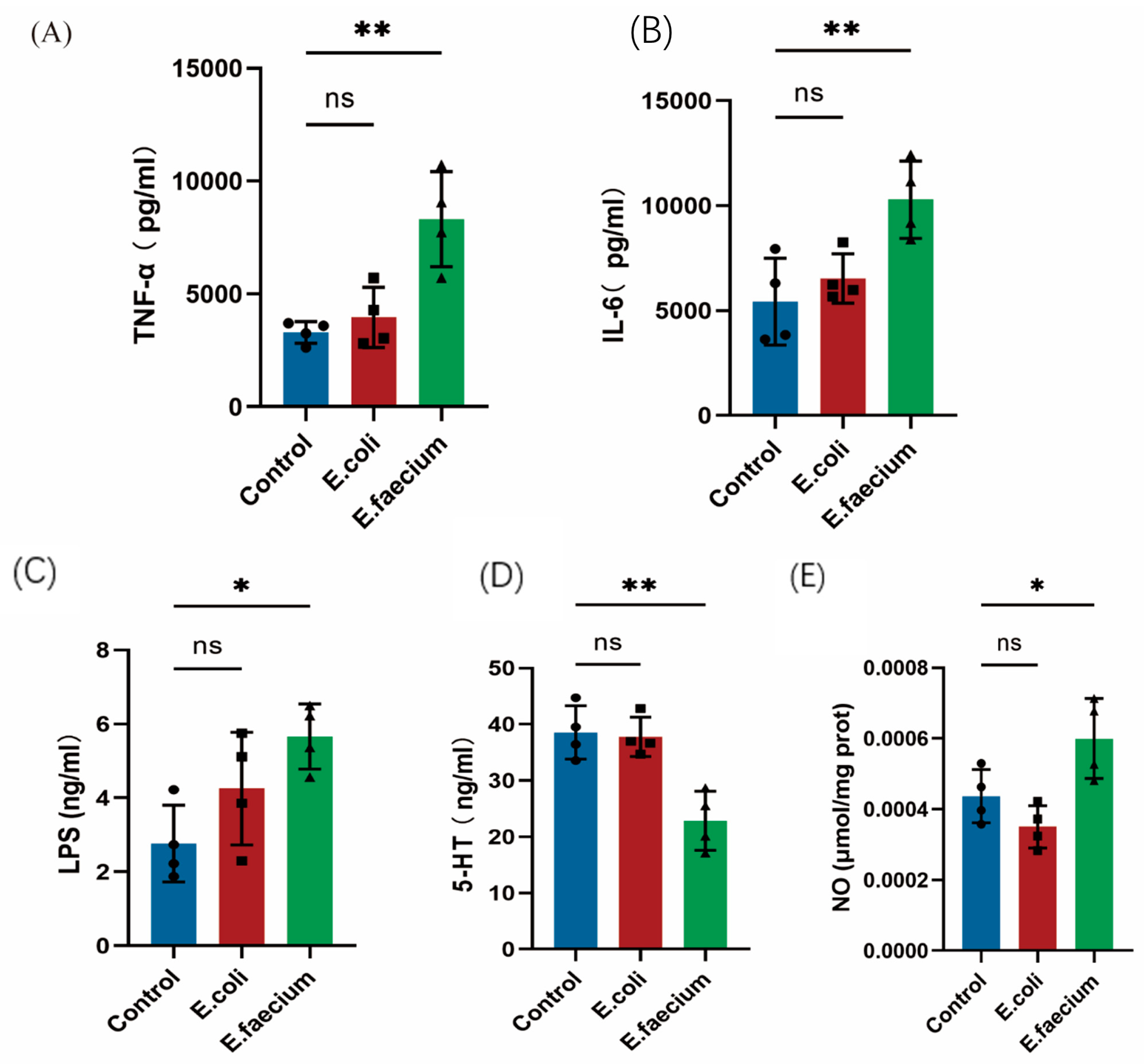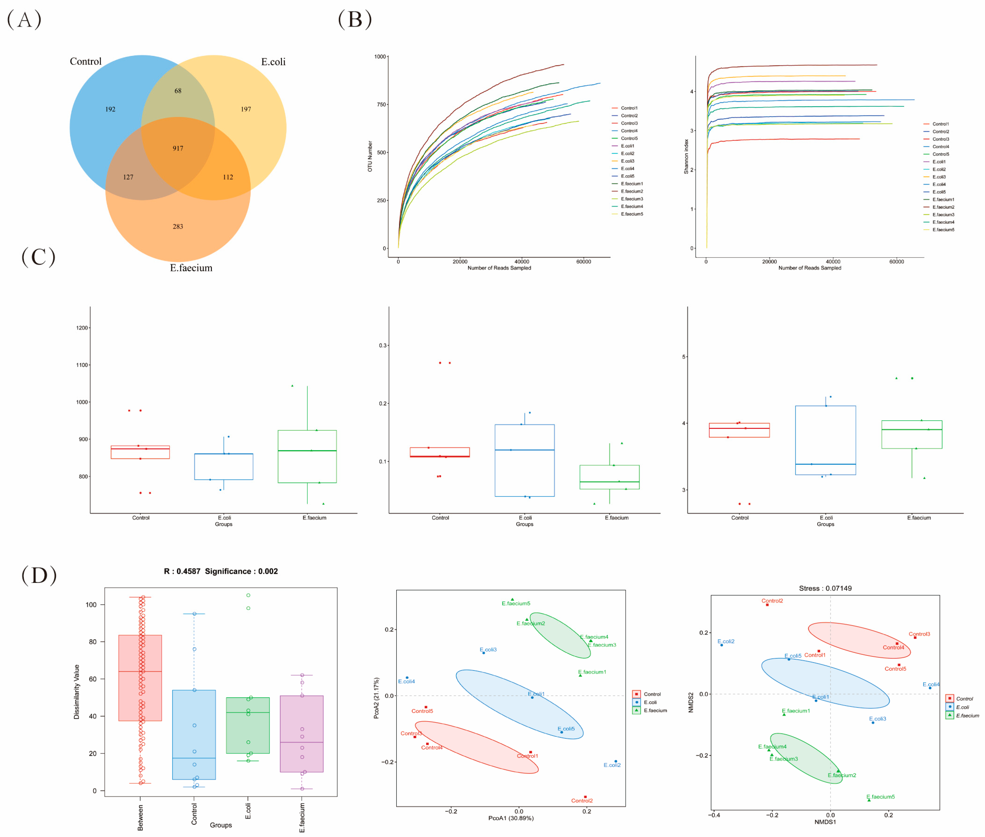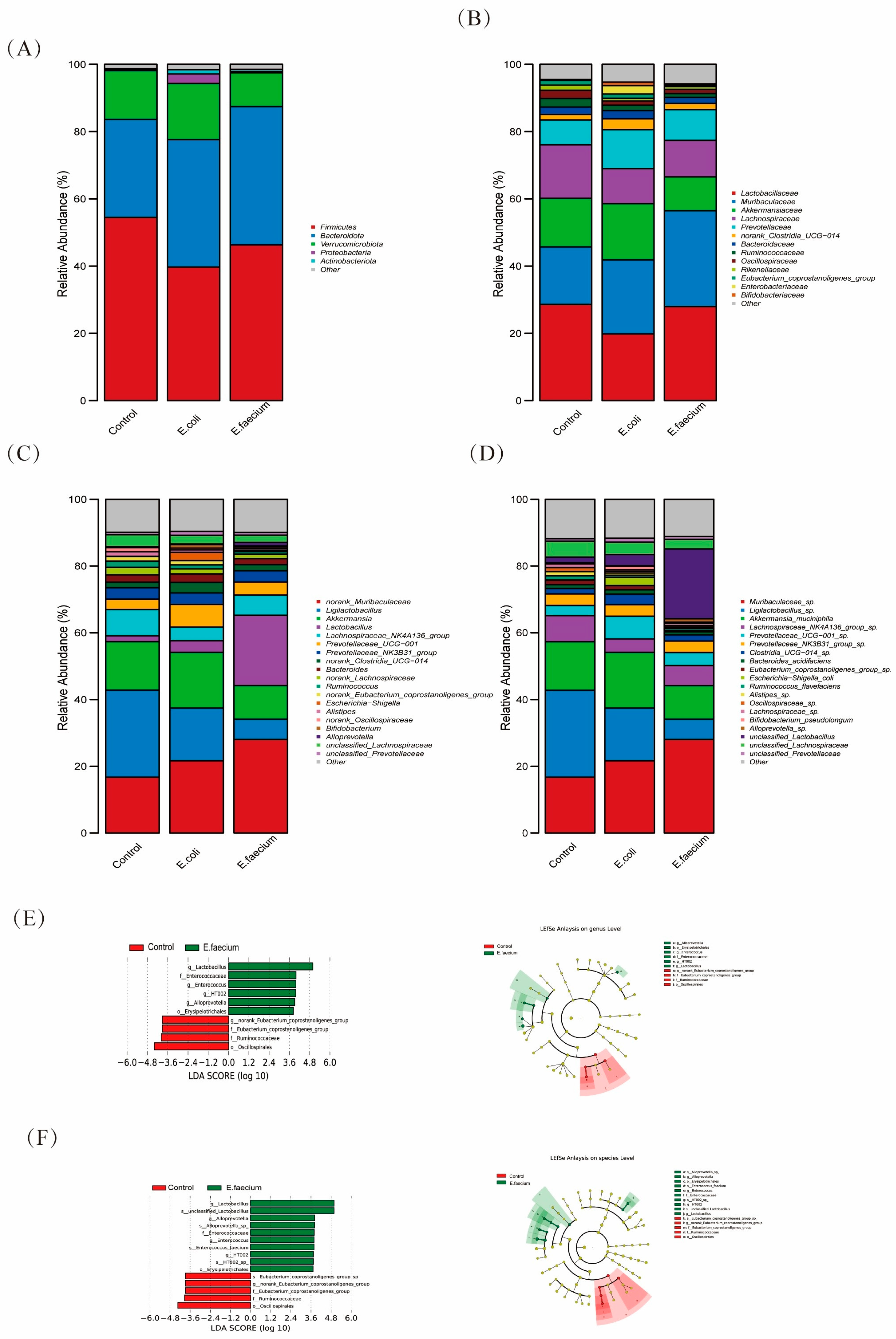3.5. E. faecium Alters Gut Microbiota at Different Taxonomic Levels