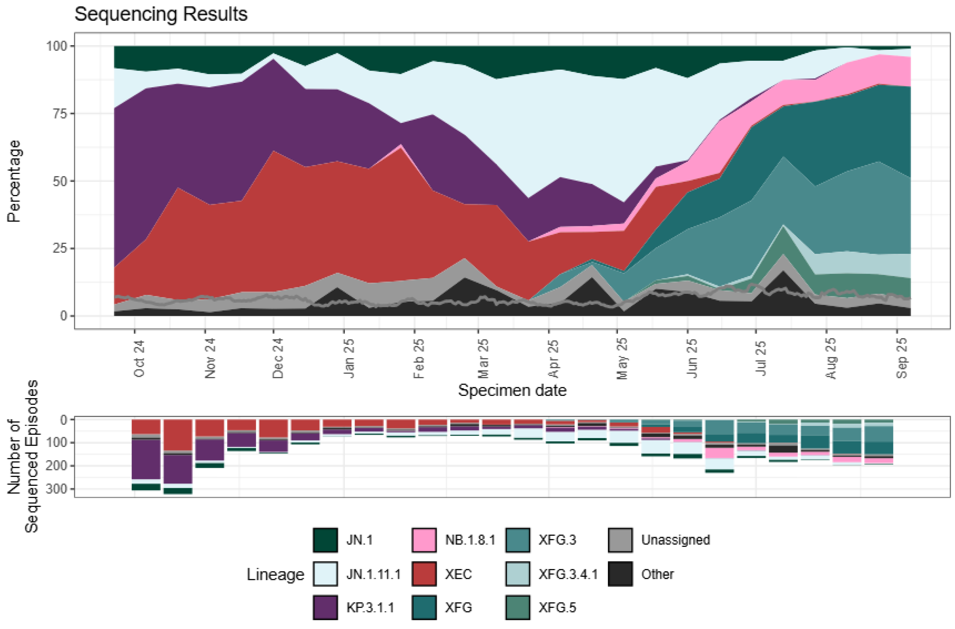 - World Health Organization. Risk Evaluation for SARS-CoV-2 Variant Under Monitoring: XFG. Available online: https://www.who.int/publications/m/item/risk-evaluation-for-sars-cov-2-variant-under-monitoring-xfg (accessed on 14 November 2025).