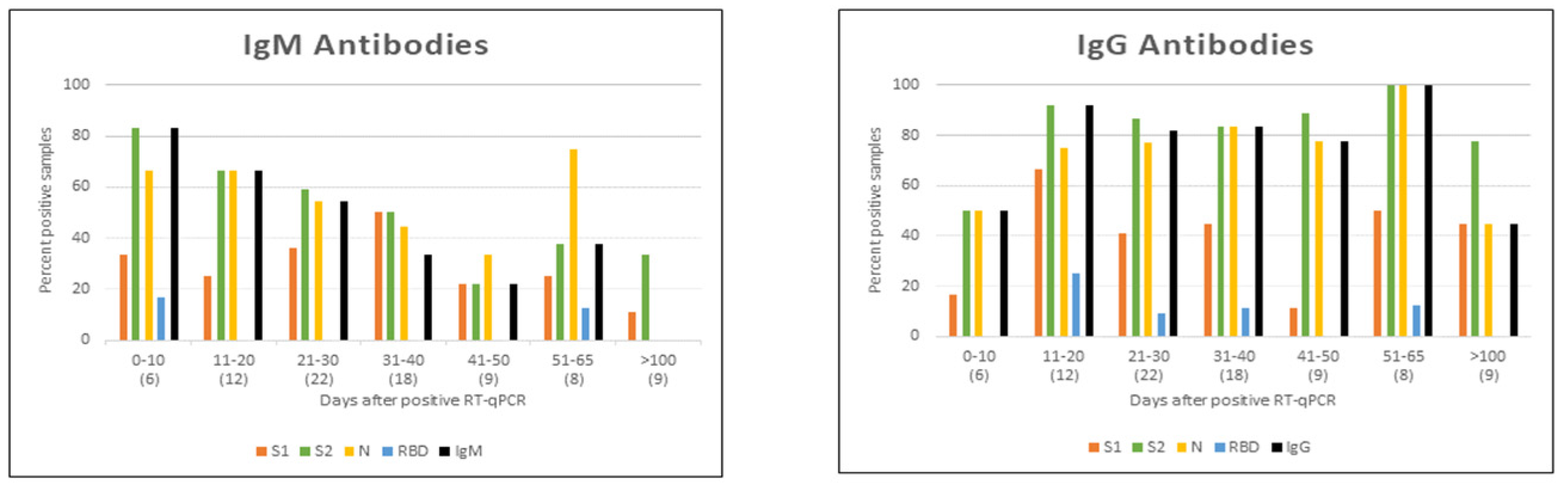 - Shah, J.; Liu, S.; Potula, H.H.; Bhargava, P.; Cruz, I.; Force, D.; Bazerbashi, A.; Ramasamy, R. IgG and IgM antibody formation to spike and nucleocapsid proteins in COVID-19 characterized by multiplex immunoblot assays. BMC Infect. Dis. 2021, 21, 325. [Google Scholar] [CrossRef]