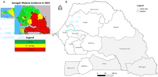 Map of Senegal showing (A) the highest malaria incidence regions (red) in the south and southeast in 2021, adapted from an NMCP report [] and (B) a highlight of the four selected study regions.