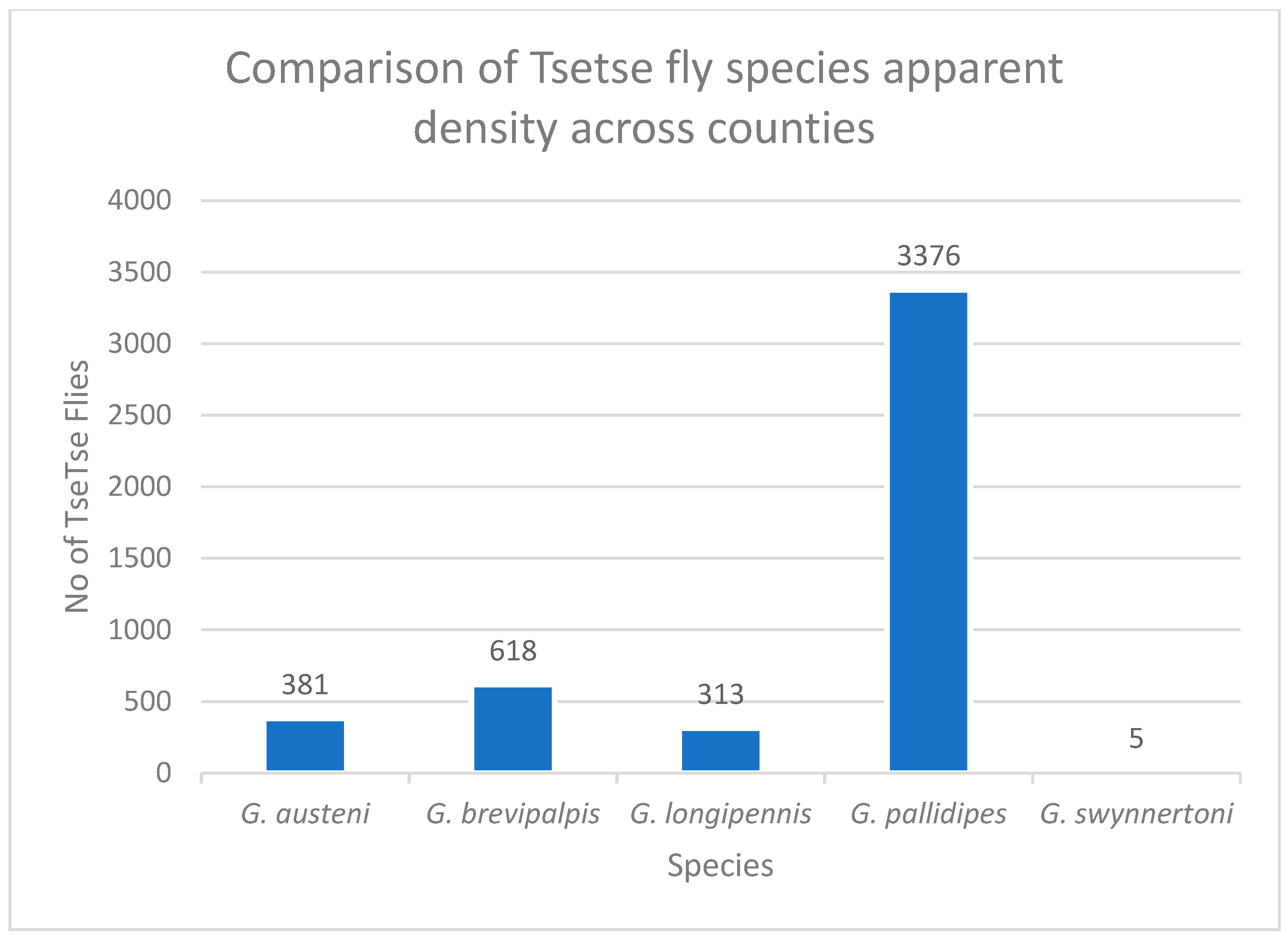 Five species of tsetse flies were collected in all five counties. Glossina pallidipes (n = 3376) was the most abundant species, followed by G. brevipalpis (n = 618), G. austeni (n = 381), G. longipennis (n = 313), and G. swynnertoni (n = 5)—Figure 3. Also, the apparent density of different tsetse fly species was statistically significant across the various counties (p-value < 0.001).