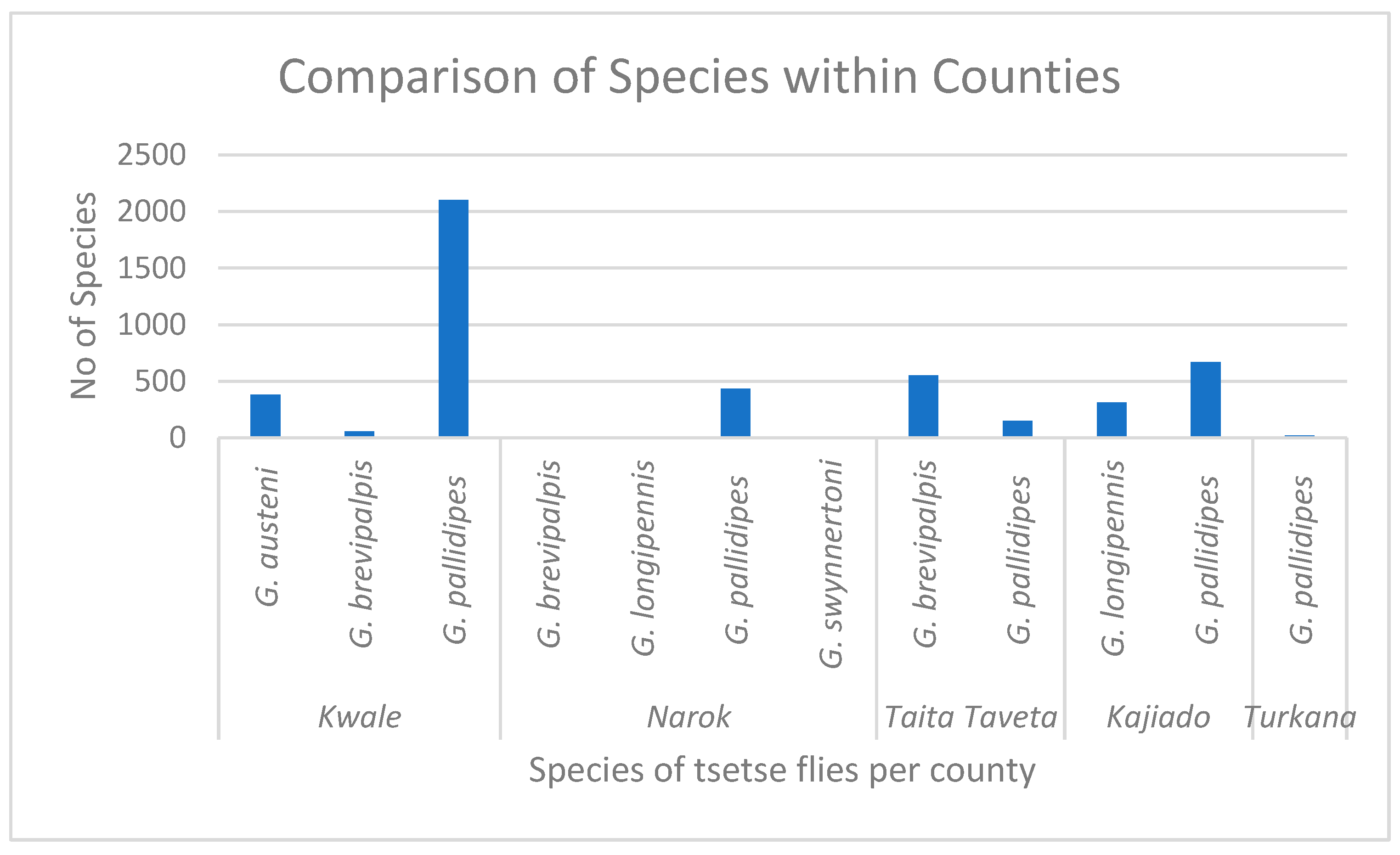 For tsetse fly species variation within each county, Kwale County had Glossina pallidipes (n = 2102), G. austeni (n = 381), G. brevipalpis (n = 55). In Taita-Taveta, two different species, Glossina pallidipes (n = 151) and G. brevipalpis (n = 552), were collected. In Kajiado County, two species, Glossina pallidipes (n = 668), G. longipennis (n = 312), were collected, and four different species, G. pallidipes (n = 435), G. brevipalpis (n = 11), G. swynnertoni (n = 5), and G. longipennis (n = 1), were collected in Narok County. Turkana had (n = 20) the G. pallidipes species collected—Figure 4. Thus, comparing the apparent density of different tsetse fly species within each county was statistically significant (p-value < 0.001).