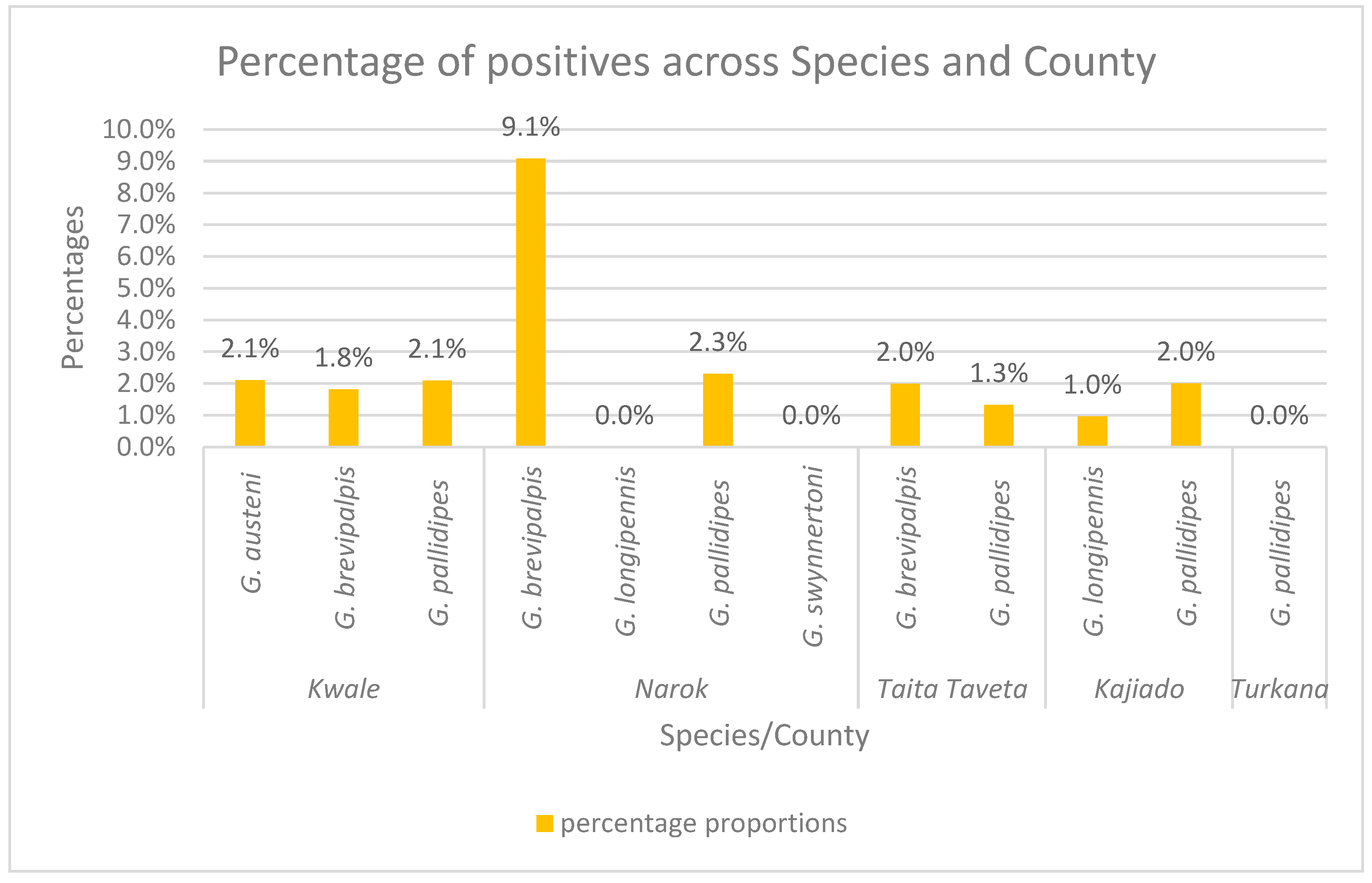 In counties like Taita-Taveta, there were more G. brevipalpis captured (n = 552) than G. pallidipes (n = 151), and the prevalence of infections was higher in G. brevipalpis (2.0%) than in G. pallidipes (1.33%). In Kwale, G. autseni and G. pallidipes had the same prevalence of infections at 2.1% each, while in Narok, G. brevipalpis had a higher prevalence of infection at 9.1% than G. pallidipes at 2.3%—Figure 7.