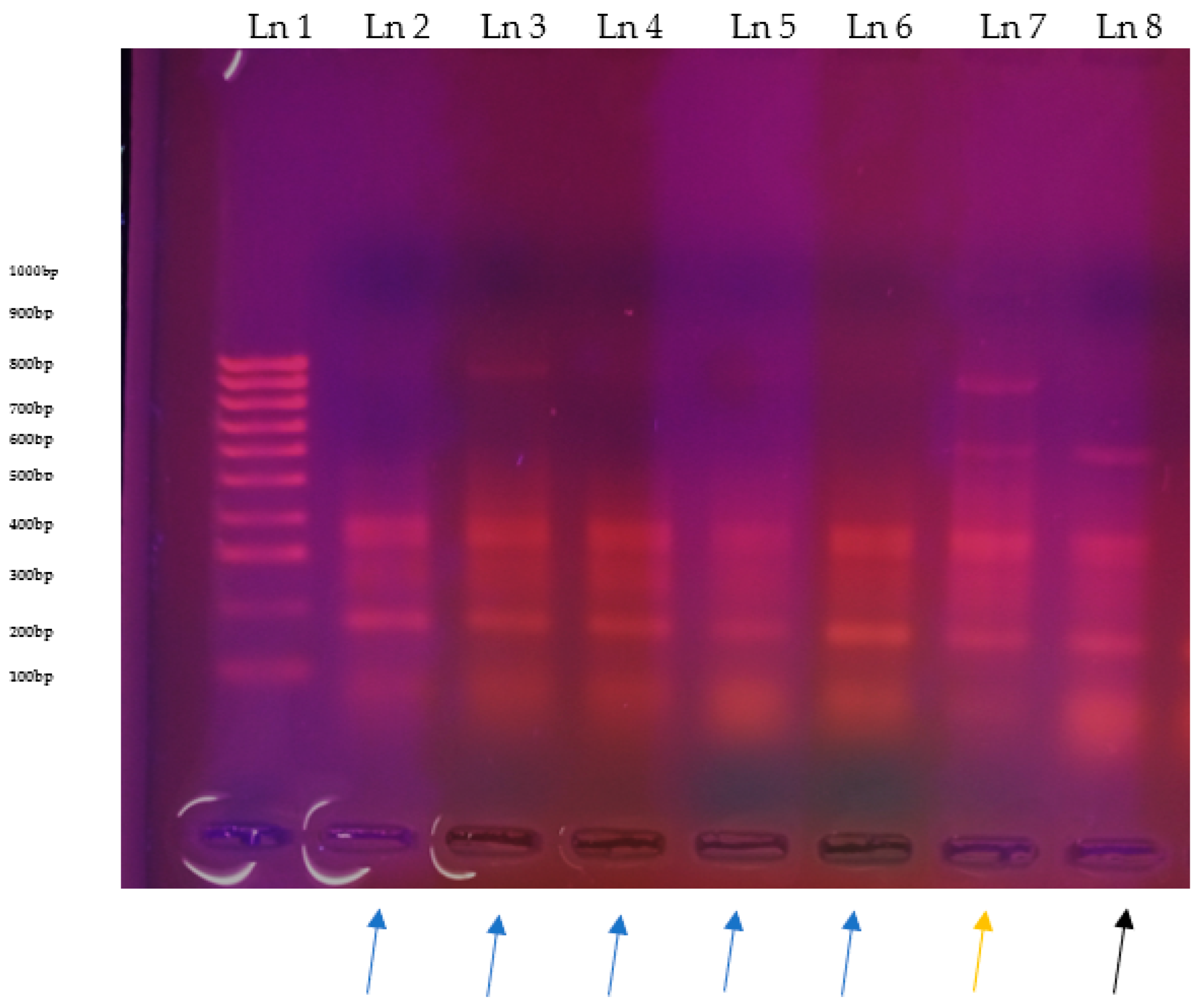 Figure 10. RFLP digestions of Ade2 gel images: Ln 1, 100 bp ladder; Ln 2, 3, 4, 5, 6, samples with two bands 248–400 bp pointed with a blue arrow at the bottom; Ln 7, sample with four bands 248–400 bp, 648 bp and 800 bp pointed with a yellow arrow, Ln 8, samples with three bands 248–400 bp and 648 bp pointed with a black arrow at the bottom.