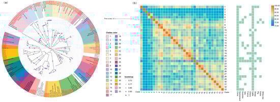 The heatmap further illustrated the genetic distances among clades, their phylogenetic relationships, and patterns of interspecies transmission and global distribution (Figure 2b). Overall, C. pecorum strains from China formed multiple clusters, several of which were unique to the country, highlighting high genetic diversity and local evolutionary adaptation. Clades 2 and 3, which were phylogenetically distinct yet closely related to each other, were detected across multiple provinces, suggesting strong dissemination potential and warranting close attention to their pathogenicity and zoonotic risk. Additionally, multiple clades were identified in three or more countries across different continents, pointing to possible intercontinental transmission. Several clusters (e.g., Clades 1, 7, 16, 21, 22, and 28) were also detected in three or more mammalian species, indicating broad host adaptability. These findings demonstrate that strains circulating in western China include lineages with enhanced transmissibility and elevated zoonotic potential, reinforcing the need for intensified surveillance.