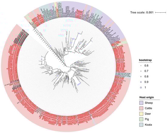 Phylogenetic analysis of C. pecorum based on multilocus sequence typing (MLST). Sequence types (STs) identified in this study are highlighted in enlarged bold font: black indicates previously reported STs, while red denotes novel STs identified here. The phylogenetic tree is color-coded by host origin, with five categories represented: cattle, sheep, koalas, pigs, and deer.