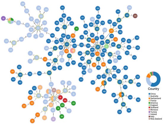 To investigate the global dissemination of C. pecorum, 114 sequence types (STs) identified in China were compared with 89 STs retrieved from the Chlamydiales PubMLST database. Phylogenetic relationships among STs were inferred using the goeBURST algorithm implemented in PHYLOViZ (version 2.0), with a double-locus variant (DLV) threshold applied to define connections [20,21]. This approach enabled visualization of evolutionary linkages and delineation of clonal complexes (CCs) based on allelic differences between strains.