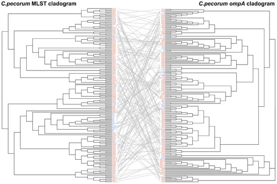 Tanglegram comparing MLST- and ompA-based phylogenies of C. pecorum. Midpoint-rooted phylogenetic trees were constructed using the maximum likelihood method and reconciled to assess topological congruence. The analysis included 136 sequences obtained in this study and 42 reference sequences from GenBank. Phylogenetic tree showing C. pecorum: red font for those identified in this study; blue font for reference strains from GenBank, with their respective names provided at the leaf of the tree.
