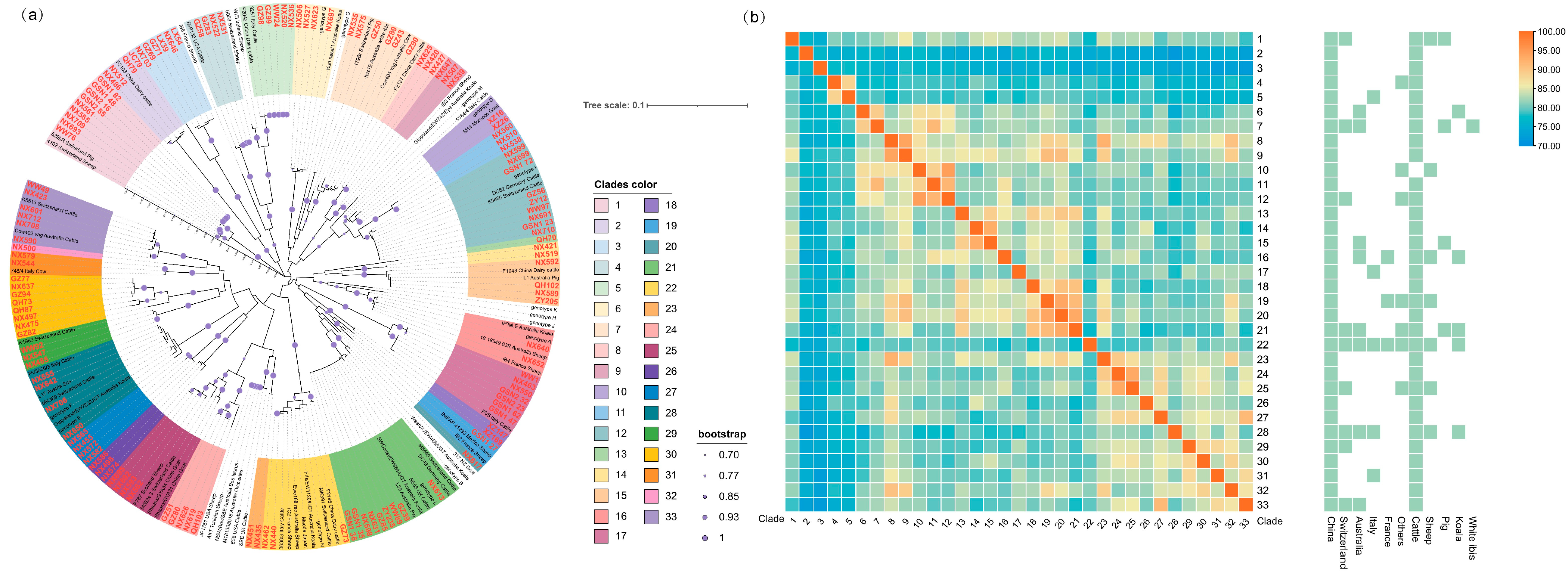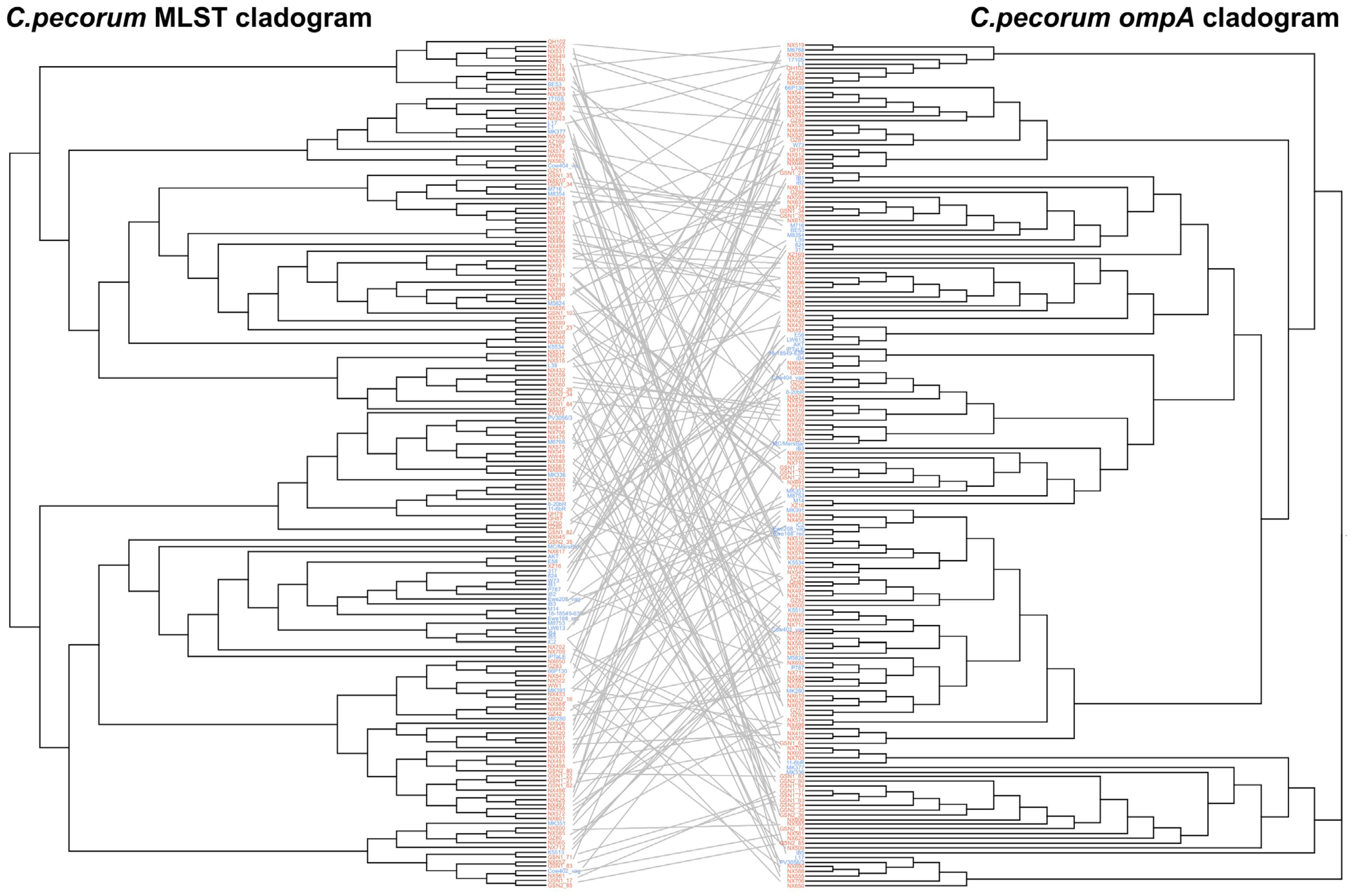 2.5. Comparison of MLST and ompA Phylogenetic Analyses in C. pecorum