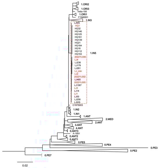 We conducted phylogenetic analysis of Yersinia pestis strains isolated from the 2022 Yunnan sylvatic plagues, along with historically isolated strains from the Lijiang sylvatic plague focus and publicly available sequences from the NCBI database. The results indicated that all nine strains isolated from the three sylvatic plague outbreaks in Lijiang in 2022 clustered together with 20 historically isolated strains from the same sylvatic plague focus in Lijiang within the 1.IN5 lineage (Figure 3). This lineage, identified as a novel phylogenetic branch by Shi et al. research group [22] in 2021, comprises strains exclusively isolated from the Lijiang sylvatic plague focus in Yunnan. These findings indicate that all three sylvatic plague outbreaks in Yunnan in 2022 originated from local reservoirs rather than external introductions.