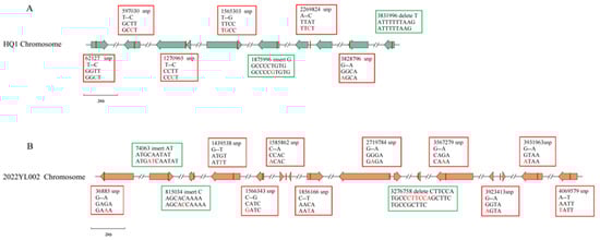 Differences in SNPs and Indels between Yersinia pestis strains isolated from wild rodents in Yunnan Province in 2022 and previously isolated strains. A right-pointing arrow corresponds to a gene sequence on the forward DNA strand, and a left-pointing arrow to one on the reverse strand. For clarity, the HQ1 and 2022YL002 chromosomal sequences are assigned different colors. Note: (A) Genomic comparison between strains isolated from Heqing in 2022 and previously isolated Heqing strains; (B) Genomic comparison between strains isolated from Lijiang in 2022 and previously isolated Lijiang strains. SNPs are highlighted in red boxes, and Indels are marked in green boxes.