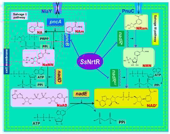 However, the role and regulation of NAD+ in the pathobiology of S. sobrinus remain unclear. Accordingly, we investigated the NAD+ biosynthesis pathway in S. sobrinus, including the nicotinic acid (NA) and nicotinamide (Nam) salvage/recycling pathway (Salvage I) and the PnuC-NadR salvage biosynthesis pathway (Salvage III), which are regulated by the NrtR family regulon, which are SsNrtR regulators. SsNrtR(S. sobrinus NrtR) resembles a Nudix-like effector domain, which is inverted, in contrast with the domains of NrtR in Streptococcus suis serotype 2 (SS2) reported in our previous study [11]. In a previous study, we demonstrated that the regulatory effect of NrtR influences the NAD+ synthesis capability of this bacterium, although it is not the primary regulatory pathway for NAD+ synthesis in the zoonotic pathogen Streptococcus suis serotype 2 (SS2) [11]. Given the pivotal role of NrtR in maintaining NAD+ homeostasis, this prompted us to further investigate its functional characteristics in other bacterial species. This study aimed to test whether S. sobrinus NrtR (SsNrtR) functions as a transcriptional repressor that directly regulates NAD+ salvage metabolism and thereby contributes to NAD+ homeostasis and physiological adaptation in this cariogenic species. We applied a functional analysis of the NrtR protein from the cariogenic bacterium S. sobrinus, which is anticipated to modulate the salvage and recycling of NA/Nam and NRam by binding to the promoter region of pncB and the pnuC-nadR operon.