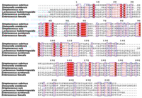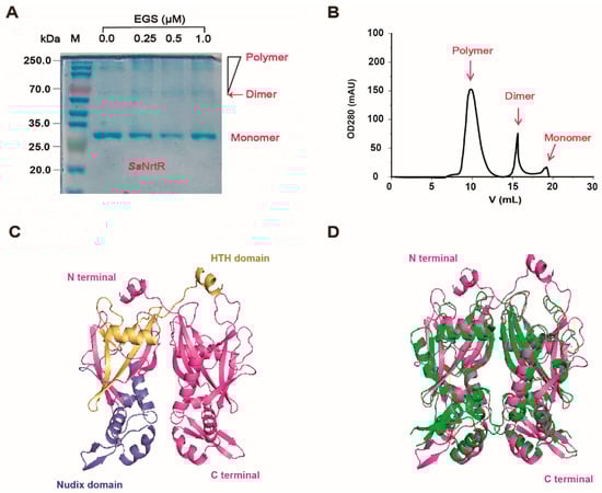 The purified protein was then analyzed for homogeneity via 10% SDS-PAGE (Figure 2A). The recombinant protein sample was highly pure, with an intense band at approximately 28 kDa, which was consistent with the expected molecular weight (Figure 2A). Here, we observed that the protein tended to form dimers. We confirmed this by EGS cross-linking, which revealed that SsNrtR forms dimers, oligomers, and multimers, with monomer levels decreasing as the EGS concentration increased (Figure 2A). The UV absorbance at OD280 during gel filtration further corroborated these findings (Figure 2B). Sequence analysis indicated that SsNrtR comprises an N-terminal winged helix-turn-helix (wHTH) domain for DNA binding and a C-terminal domain that is characterized by hydrolytic enzyme activity and is homologous to ADP-ribose (ADPR) pyrophosphatases of the Nudix family (Figure 2C). Structural alignment of NrtR proteins in S. sobrinus (SsNrtR, in magenta) and in Shewanella oneidensis (SoNrtR, in green) highlights the similarity in protein spatial structure and functional domains (Figure 2D). The SsNrtR protein has significant sequence conservation with its counterparts in various streptococcal species [11] and other distantly related organisms (Figure 3).