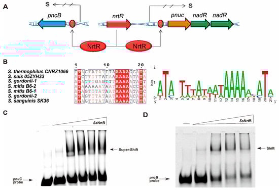 The NrtR protein from S. sobrinus was incubated with 200 bp DNA fragments that encompass the predicted binding sites within the pncB and pnuC promoter regions (Figure 4A), and it was observed that Streptococcus species, including S. sobrinus, possess 1 to 2 NrtR-binding sites within their genomes (Figure 4B). An electrophoretic mobility shift assay revealed a dose-dependent shift, even a supershift, confirming that SsNrtR bound to the specific pnuC probe (Figure 4C) to also regulate the nadR gene since the two genes are organized into an operon (pnuC-nadR operon). An analogous shift was observed in the pncB probe (Figure 4D), suggesting that the SsNrtR regulon can regulate the NAD+ salvage I pathway (NA salvage pathway) and salvage III biosynthesis pathway (Pnuc-NadR pathway) via its N-terminal DNA-binding domain.