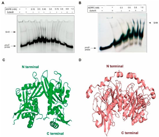 ADPR, a key intermediate in NAD+ catabolism, has been identified as an essential regulatory mechanism in Streptomyces species and plays a critical role in their cellular metabolism and signaling pathways [19]. To explore the role of ADPR in SsNrtR regulation, ADPR was introduced at various concentrations. The protein concentrations were also varied. A 200 bp DNA fragment containing the pnuC/pncB gene promoter was synthesized by combining pnuC-F/R and pncB-F/R. The EMSA data revealed that the interaction between SsNrtR and the pnuC/pncB DNA probe was disrupted by ADPR in a concentration-dependent manner (Figure 5A,B), in accordance with the phenomena observed in S. suis [11].