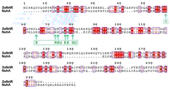 Sequence alignment of the SsNrtR and NuhA proteins. The protein sequences of the NrtR homologs were aligned via ClustalW2. The resulting photographs were generated via the ESPript 2.2 program. Identical residues are indicated with white letters on a red background. Similar residues are illustrated in black letters with a yellow background. Varied residues are in black letters, and dots represent gaps. The amino acids indicated by the arrows are the Nudix motif GX5EX7REUXEEXGU, where U is a hydrophobic amino acid, usually Ile, Leu, or Val.