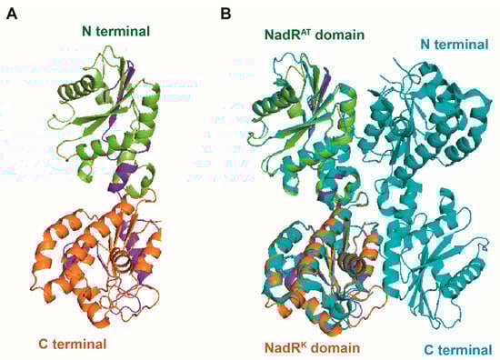 Structural characteristics of the SsNadR protein. (A) Ribbon illustration of the modeled structure of the SsNadR protein. (B) Structural alignment of NadR proteins in S. sobrinus (SsNadR, in limon and orange) and Lactococcus lactis (LlNrtR, in navy blue). The SsNadR protein contains two domains: the N-terminal nicotinamide mononucleotide adenylyltransferase domain (nadRAT, in limon) and the C-terminal icotinamide riboside kinase domain (nadRK, in orange).