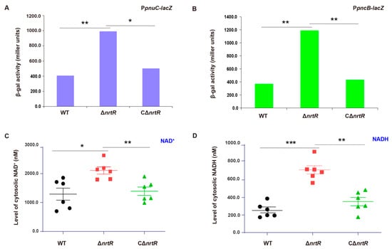 To determine whether NrtR transcriptionally regulates NAD+ salvage pathways in S. sobrinus, we constructed the ΔnrtR mutant via allelic exchange and a corresponding complemented strain, CΔnrtR. To assess the transcriptional regulation of the pnuC and pncB promoters by SsNrtR, the lacZYA reporter fusion plasmid, pVA838-PpnuC/pVA838-PpncB, were constructed (Supplemental Table S2). The plasmids were transformed into the wild-type (WT), ΔnrtR mutant, and complemented CΔnrtR strains. β-Galactosidase activity assays revealed that pnuC and pncB expression were significantly elevated in the ΔnrtR mutant compared to the WT during both mid-logarithmic and stationary growth phases and the difference was statistically significant (p < 0.01), while expression in the complemented strain were restored to WT levels(Figure 8A,B). Consistent with this deregulation, direct quantification showed a 2–3-fold increase in cytosolic NAD+ and NADH concentrations in the ΔnrtR mutant relative to the parent strain (Figure 8C,D). Intracellular NAD+ levels were significantly elevated in the ΔnrtR mutant compared to the wild-type (p < 0.05), whereas NADH concentrations in the ΔnrtR mutant showed a marked increase relative to the wild-type (p < 0.001). These in vivo findings corroborate the EMSA results (Figure 4C,D), demonstrating that SsNrtR acts as a transcriptional repressor of the NAD+ salvage pathways, PncA-PncB-NadD-NadE salvage I and PnuC-NadR salvage III pathways and plays a critical role in maintaining NAD+/NADH homeostasis in S. sobrinus.
