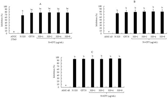 According to the classification of Stepanović et al. [20], the strain ATCC 27543 and isolate AMC-43 were classified as moderate biofilm producers (++), whereas isolate AMC-48 was considered a strong biofilm producer (+++) (Table 4). Regarding the effect of N, CFT, and N + CFT combinations on biofilm synthesis, all treatments inhibited the synthesis of this virulence factor in the three pathogenic bacteria evaluated, compared to the untreated controls (p ≤ 0.05) (Figure 1A–C). The inhibition percentage ranged from 67.8 to 95.9% among the three bacteria. However, no differences were observed in the inhibition of most combinations of N + CFT and individual treatments of N and CFT. These results show that it was not possible to detect an enhancing effect of N on CFT inhibiting biofilm synthesis. Nevertheless, one noteworthy aspect is that all treatments inhibited the synthesis of biofilm, which was additionally reflected in the recategorization of the bacteria as follows: S. aureus ATCC 27543 was reclassified from a moderate (OD = 0.29) to a weak producer (OD = 0.06); AMC-43 from a moderate (OD = 0.25) to a non-producer (OD = 0.05); and AMC-48 from a strong (OD = 1.28) to a weak producer (OD = 0.06) (Table 4).