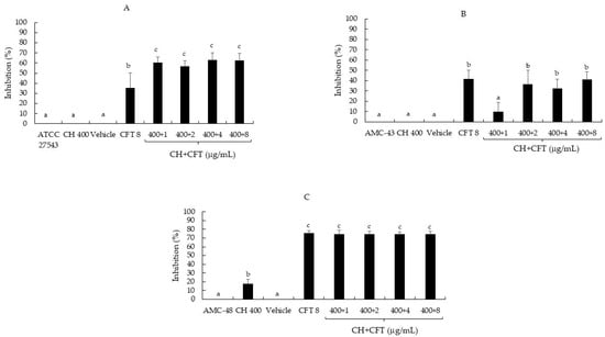 Inhibition percentage of S. aureus biofilm production by chitosan (CH), ceftiofur (CFT), and CH + CFT after 24 h of incubation. (A) S. aureus ATCC 27543. (B) S. aureus AMC-43. (C) S. aureus AMC-48. The vehicle used was: 1% acetic acid, pH 5.6. Evaluation of different combinations of CH + CFT are shown. Graph represents the mean ± standard deviation. Different letters within each column indicate significant differences according to Tukey’s test (p ≤ 0.05).