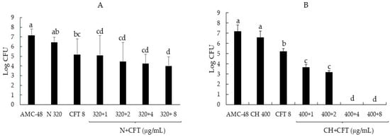 Reduction in the logarithmic growth of the AMC-48 isolate of S. aureus from inside the biofilm following the addition of biocompounds, antibiotic, and their combinations. (A) Nisin (N), ceftiofur (CFT), and their mixes. (B) Chitosan (CH), ceftiofur (CFT), and their mixes. Graph represents the mean ± standard deviation. Different letters indicate significant differences according to Tukey’s test (p ≥ 0.05).