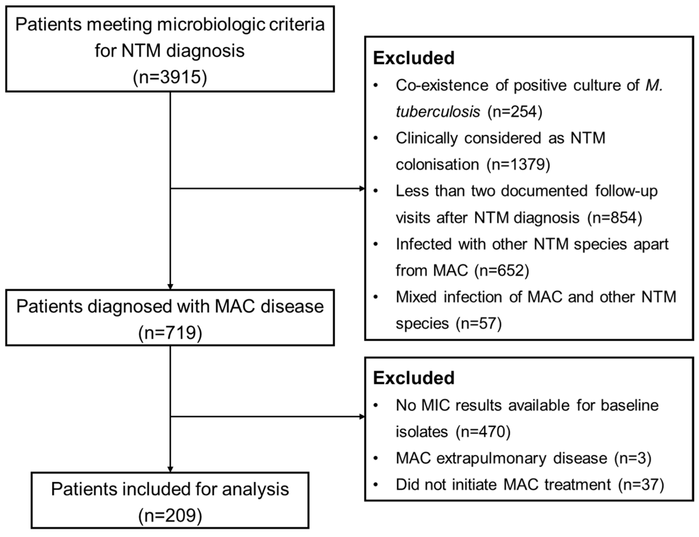 - Kim, J.Y.; Hwang, H.; Yim, D.; Choi, Y.; Kim, T.S.; Whang, J.; Kwak, N.; Yim, J.J. Relationship Between Clarithromycin Minimum Inhibitory Concentrations and Treatment Responses in Mycobacterium avium Complex Pulmonary Disease. Clin. Infect. Dis. 2025, 80, 637–643. [Google Scholar] [CrossRef] [PubMed]