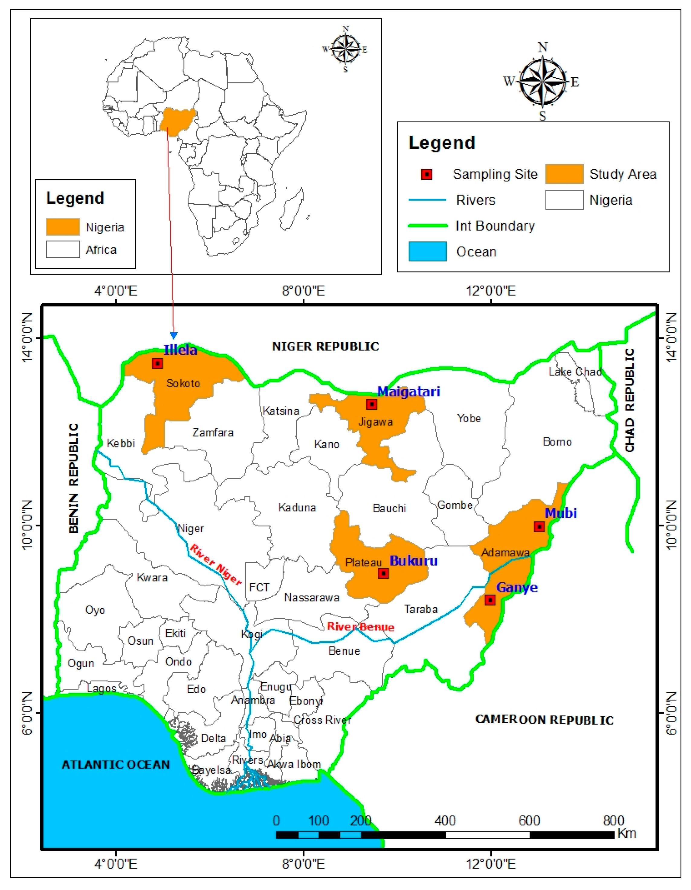 - Aminu, N.; Aminu, N.; Muhammad, S.S.; Idris, A.A. Population distribution of cattle, sheep and goat in Nigeria. Niger. J. Anim. Prod. 2024, 51, 874–877. [Google Scholar]