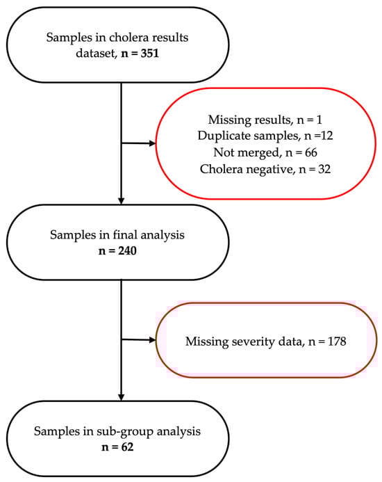 Stool samples were collected in sterile containers and transported to the Basic Science and Immunology laboratory within 24 h at 4 °C. Upon arrival, samples were stored at −80 °C until analysis for cholera and multi-pathogen screening. Total nucleic acid extraction followed a previously described protocol []. Stool samples weighing approximately 150 mg were homogenized in SK 38 bead-beating tubes containing easyMAG® Lysis Buffer (bioMérieux S.A., Marcy l’Etoile, France). The resulting homogenate was then centrifuged at 14,000 RPM for 2 min, and 200 μL of the supernatant was utilized for subsequent nucleic acid extraction using the Qiagen MinElute Kit (Qiagen, Hilden, Germany) according to the manufacturer’s instructions. Eluted nucleic acid was stored at −80 °C until ready for use.