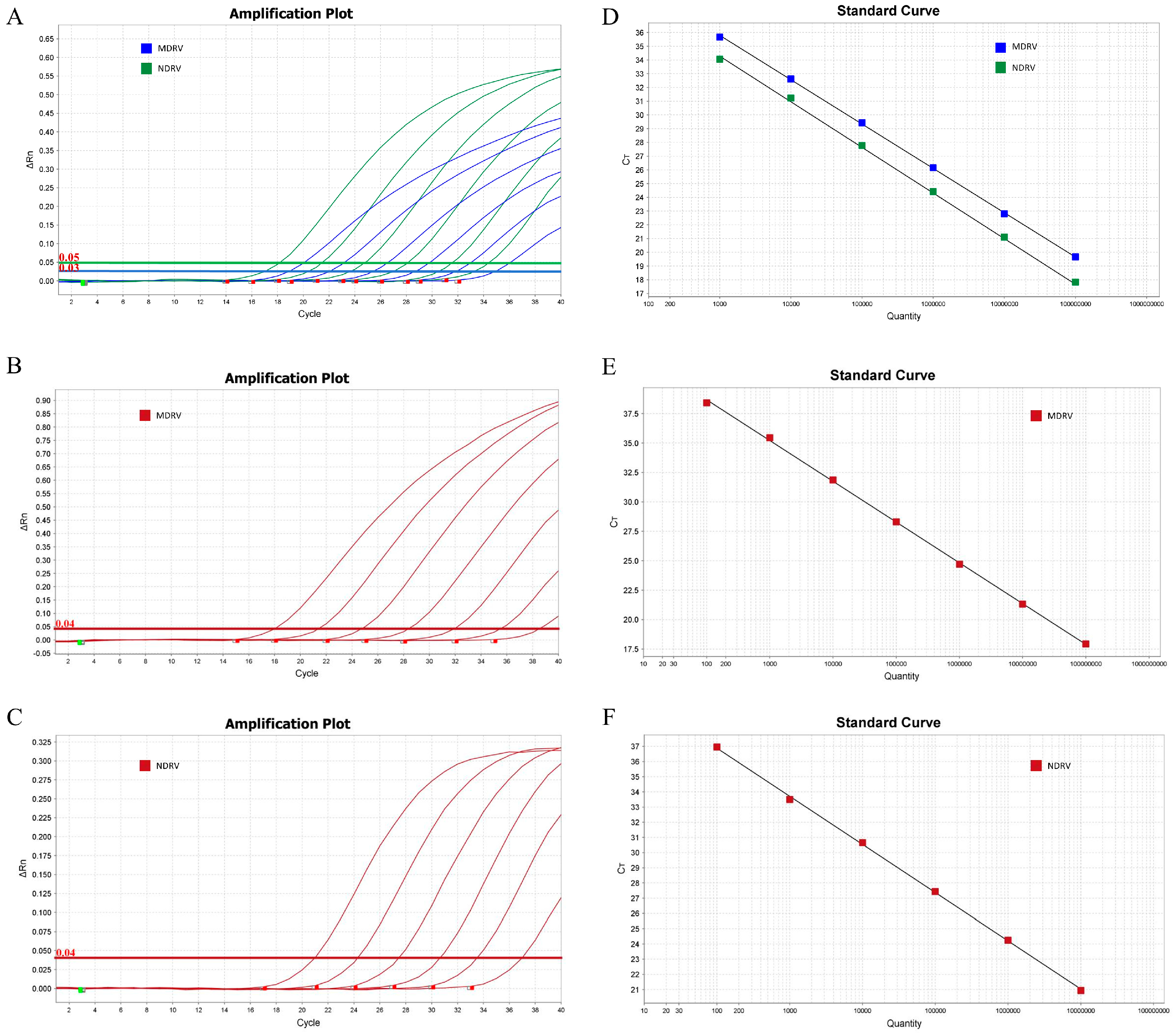 - Liu, H.; Wang, C.; He, Y.; Wu, Q.; Chen, J.; Wang, K. Development of duplex crystal digital PCR (dPCR) assay for detection and differentiation of NDRV and MDRV. Vet. Anim. Sci. 2025, 30, 100502. [Google Scholar] [CrossRef] [PubMed]