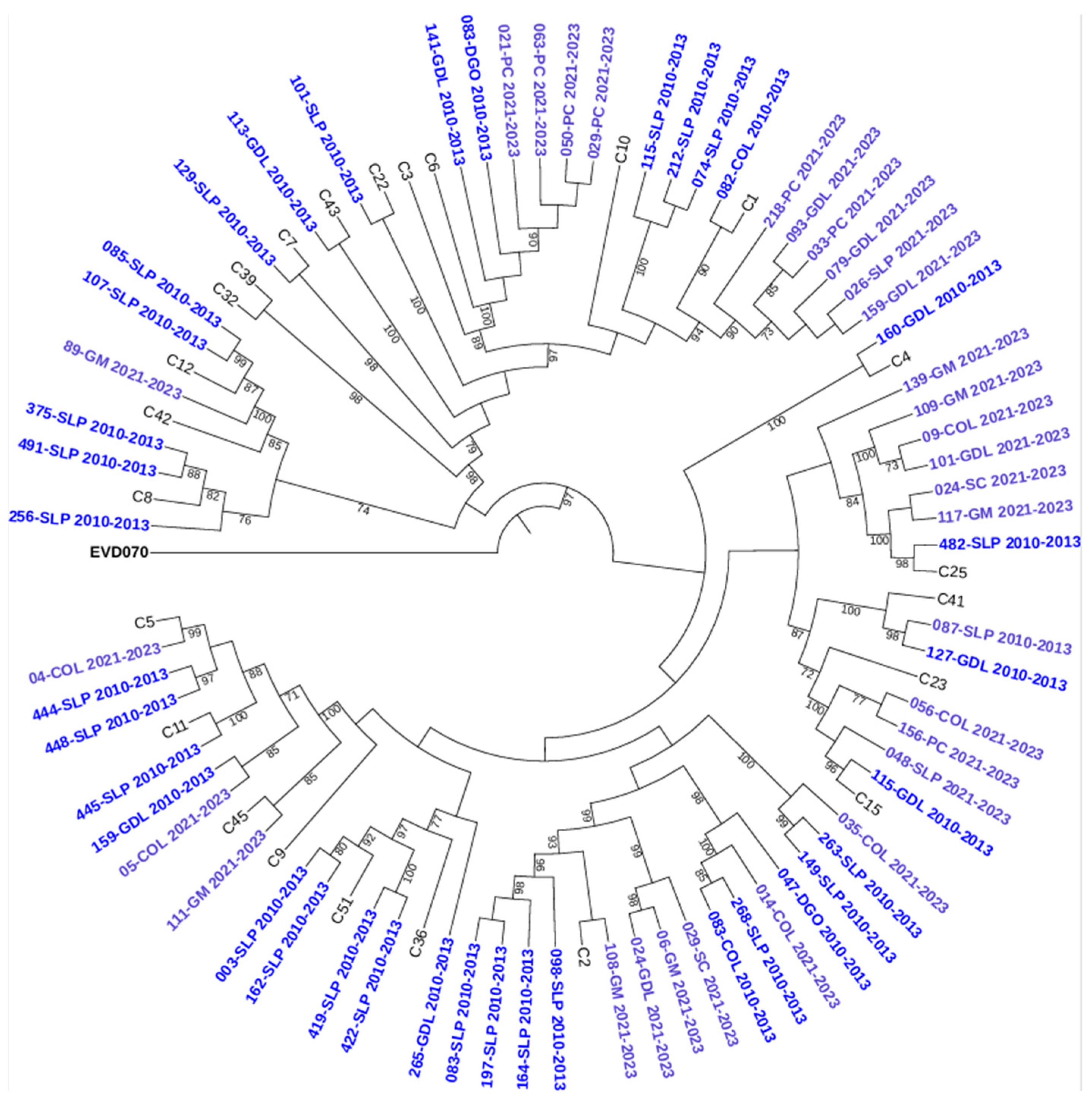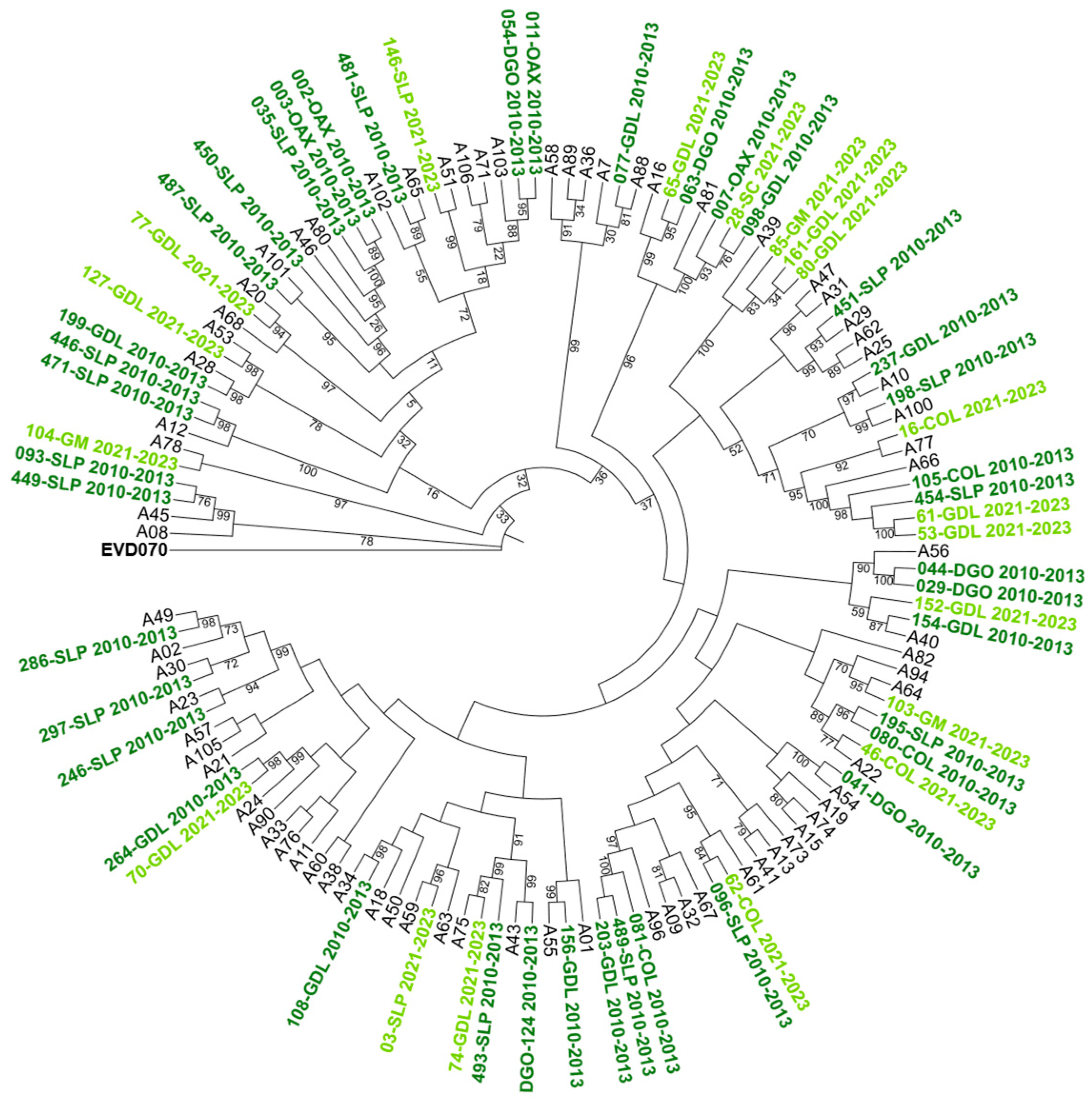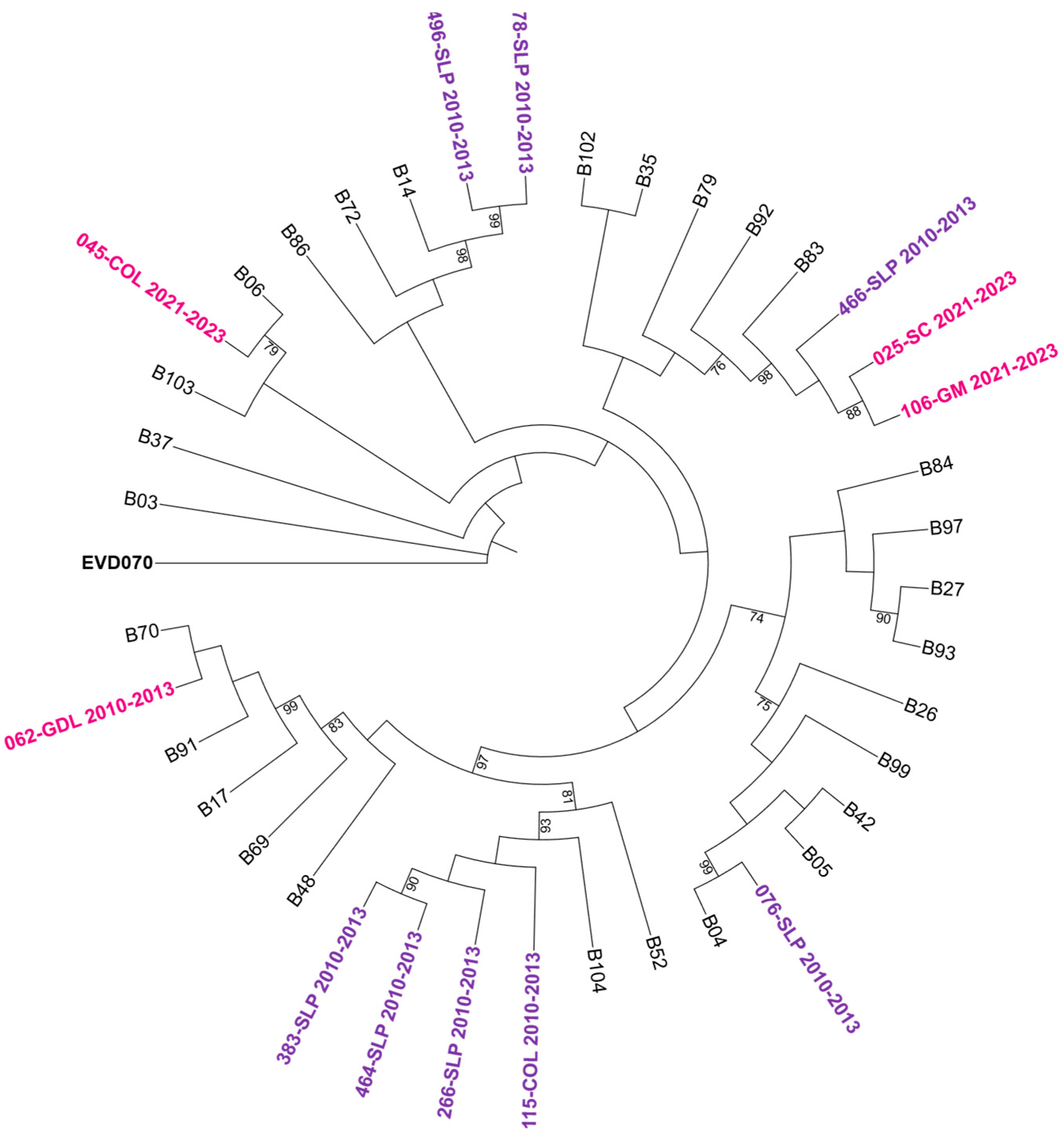 3.5. Genotypic Diversity and Phylogenetic Analysis