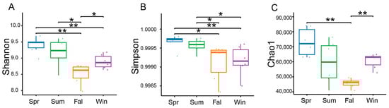 Figure 2. Seasonal variation in the α-diversity of potential pathogenic microorganisms in François’ langurs. Box plots illustrating species richness and diversity across samples from different seasons. α-diversity was evaluated using the Shannon (A), Simpson (B), and Chao1 (C). * p < 0.05, ** p < 0.01 (Wilcoxon rank-sum test).