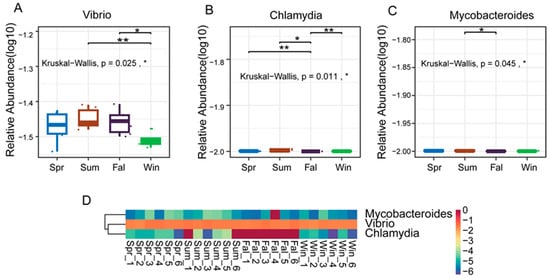 The study applied the non-parametric Kruskal–Wallis (KW) rank-sum test to evaluate differences in species abundance among groups. Initially, a global KW test was conducted for all species to identify those exhibiting significant overall differences. Subsequently, the top abundant species were subjected to pairwise comparisons between groups. Relative abundance boxplots and heatmaps were generated to visualize the distribution of dominant differential species across groups. At the genus level, three pathogenic genera—Vibrio, Chlamydia, and Mycobacteroides—exhibited significant seasonal differences in relative abundance (p < 0.05). Vibrio showed nearly significant variation between summer and winter (p < 0.01) (Figure 4A), and a significant difference between fall and winter (p < 0.05). Chlamydia displayed nearly significant differences between spring and fall (Figure 4B), fall and winter (p < 0.01), while a significant difference was observed between summer and autumn (p < 0.05). Mycobacteroides demonstrated a significant difference between summer and autumn (p < 0.05). As illustrated in the boxplots and heatmaps (Figure 4C), these genera exhibited distinct seasonal abundance patterns. Vibrio tended to be more abundant in the summer and fall, whereas Chlamydia and Mycobacteroides showed notable fluctuations between transitional and extreme temperature periods.