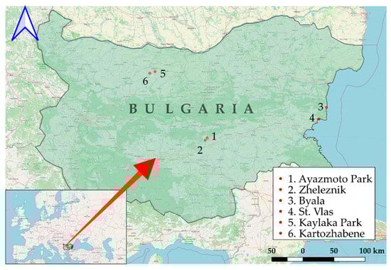 The ticks were collected from three geographic regions in Bulgaria between 2020 and 2022: Stara Zagora (Metodi Kusev Park and Zheleznik), Black Sea Coast (Byala and Sveti Vlas), and Pleven (Kaylaka Park, and Kartozhabene) (Figure 1). Geographic mapping was conducted using Quantum Geographic Information Systems (QGIS version 3.18.0, QGIS Development Team, GNU General Public License, Essen, Germany) with the World Geodetic System 1984 (WGS 84) as a standard of coordinate referencing.