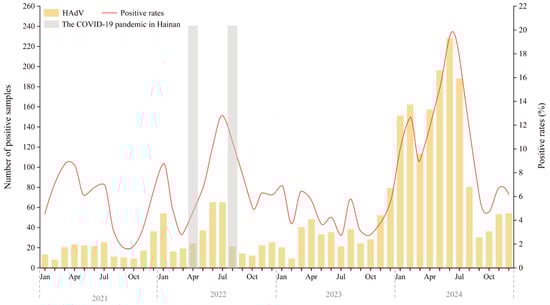 Annual Trends and Monthly Distribution of HAdV Infections Among Hospitalized Children in Hainan (2021–2024). The gray-shaded areas indicate the two major local SARS-CoV-2 epidemic waves on Hainan Island (March–April 2022 and August–September 2022), which occurred under the national Dynamic Zero-COVID policy that remained in effect until 7 December 2022. Abbreviations: Jan, January; Apr, April; Jul, July; Oct, October.