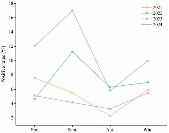 Seasonal patterns varied significantly over the years. For the purposes of this study, spring was defined as March–May, summer as June–August, autumn as September–November, and winter as December–February. In 2021, positivity rates were higher in spring (7.58%), summer (5.52%), and winter (5.96%), with autumn being the lowest (2.29%) (χ2 = 39.512, p < 0.001). In 2022, summer showed the highest positivity (11.24%), with significant seasonal differences (χ2 = 50.513, p < 0.001). In 2023, spring and winter had higher rates than autumn (χ2 = 18.190, p < 0.001). In 2024, positivity peaked in summer (16.98%), followed by spring (12.03%) and winter (10.01%) (χ2 = 158.75, p < 0.001) (Table 1, Figure 2).