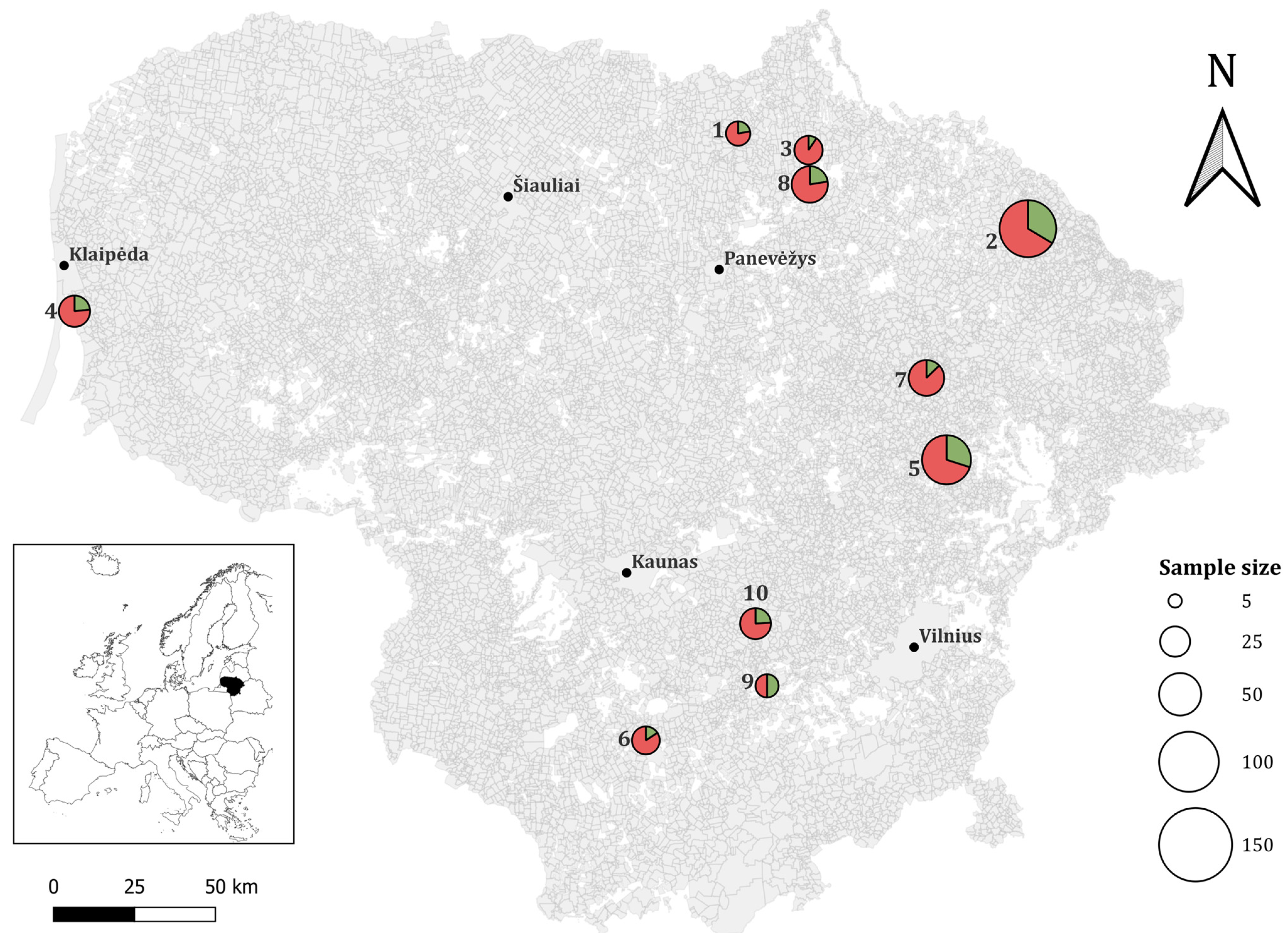 3.1. Prevalence of T. gondii in Wild Rodent Species in Lithuania