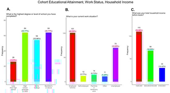 In this study, we expected significant differences in cohort education and socioeconomic status. We observed that 12.5% of participants had less than a school education, with 30.8% attaining a high school diploma or GED, 25.9% having some college education, and 30.8% having a bachelor’s degree or above (Figure 2A). We show that 48.6% of participants were fully employed at the time of the survey, 33.7% were unemployed, 5.8% were self-employed, 6.7% were working full-time, and the remainder had other work arrangements (Figure 2B). We observed that 52.9% of participants had household incomes before taxes of <USD 35,000, 32.7% had incomes between 35,000 and 100,000, and 14.4% had incomes of 100,000 or more (Figure 2C).