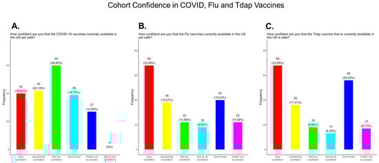 Mistrust and misinformation surrounding the development and dissemination of the COVID-19 vaccines was a driver of vaccine hesitancy that greatly impacted vaccine confidence and uptake in the USA [29,30,31]. Decades of racial injustice and cultural insensitivity experienced by the medically underserved and rural communities fueled COVID-19 vaccine hesitancy, especially in the South, including Tennessee [32]. We observed that only 39.4% of participants in this study were very confident or somewhat confident in the safety of the COVID-19 vaccine compared to 51.0% and 50.0% confident or somewhat confident in the safety of the flu and Tdap vaccines, respectively (Figure 4). Other variations in confidence or no confidence for the different vaccines are shown in Figure 4.