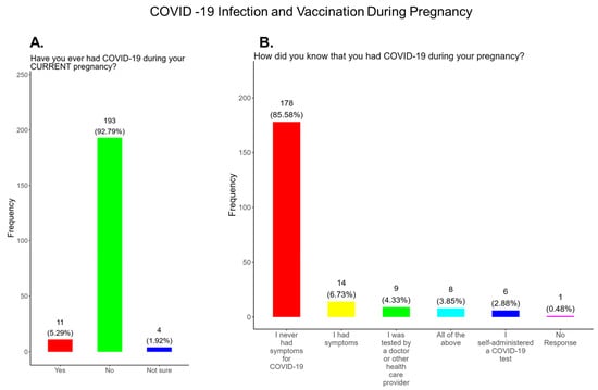 The American College of Obstetrics and Gynecology (ACOG) updated its clinical guidance as of 22 August 2025, supporting COVID-19, Flu, Pertussis, and RSV vaccinations during pregnancy [6]. The updated Practice Advisory COVID-19 Vaccination Considerations for Obstetric-Gynecologic Care recommends that patients receive an updated COVID-19 vaccine or “booster” at any point during pregnancy, when planning to become pregnant, in the postpartum period, or when lactating [6]. This study was performed prior to the announcement on 27 May 2025 by the head of the Department of Health and Human Services that stated that COVID-19 vaccines were no longer recommended for pregnant women [5]. It is well documented that the COVID-19 vaccine is effective and safe for women during pregnancy and the infant after birth [32]. It has been shown that antibody persistence in infants was observed when compared to infants whose mother experienced infection during pregnancy without vaccination. Neonatal complications in babies born to mothers infected with COVID-19 that were unvaccinated can include preterm birth, severe neonatal morbidity, medically indicated preterm birth, and severe perinatal morbidity and mortality [32]. We observed that only 44.2% of participants knew that the COVID-19 vaccine was recommended for all pregnant women in the USA, while 55.7% either did not know or were unsure that the COVID-19 vaccine was recommended during pregnancy (Figure 5A). In addition, only 48% of participants knew that receiving COVID-19 and not being vaccinated could put themselves and their babies at risk of complications and severe disease (Figure 5B). In addition, 52.0% of participants did not know or were unsure of the complications and severe disease associated with COVID-19 for them and their babies if the mother became infected and was not vaccinated (Figure 5B). Our study showed that 11 (5.3%) had COVID-19 during their current pregnancy, while 92.8% said that they did not contract COVID-19 during their current pregnancy and 1.9% were unsure (Figure 6A). However, when asked how they knew they had COVID-19, a majority responded that they had symptoms, followed by being tested by a physician and by using a self-administered COVID-19 test (Figure 6B).