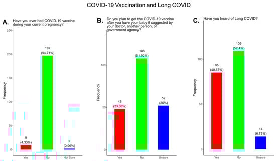 In our study, we observed that only 4.3% of participants received a COVID-19 vaccine, while 95.7% did not or were unsure of receiving a COVID-19 vaccination during their current pregnancy (Figure 7A). Only 23% of participants said that they planned to receive a COVID-19 vaccine after delivery if prompted by a physician or government agency, and 72.9% declined receiving a COVID-19 vaccine postpartum (Figure 7B).