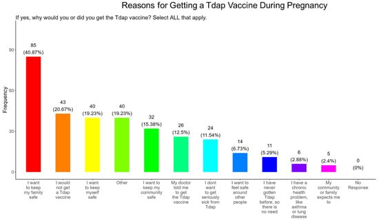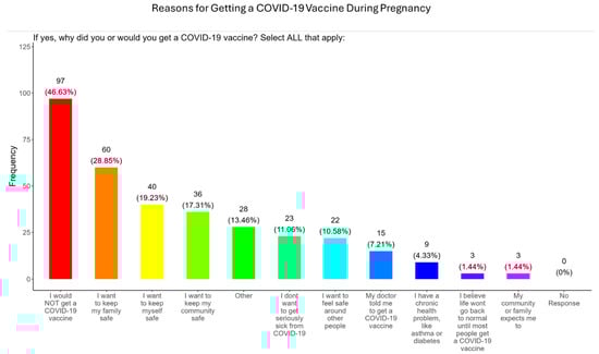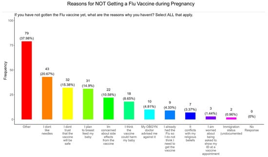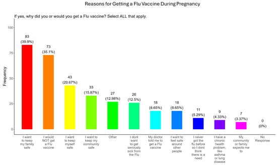 In our study, when participants were asked why did or why would they receive the flu vaccine during pregnancy, the majority (40.0%) responded that they wanted to receive the flu vaccine for family and personal safety (21.0%), community safety (15.9%), serious illness from flu (12.5%), because of advice from the doctor (8.7%), safety around others (8.7%), unnecessary because they never had the flu (5.3%), because they had preexisting health conditions (4.3%), and because it was expected by community and family (3.4%) (Figure 14). The remainder of participants declined receiving a COVID-19 vaccine (35.1%) or had other reasons for receiving/wanting the vaccine (13.0%) (Figure 14).