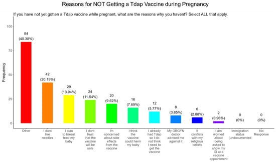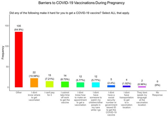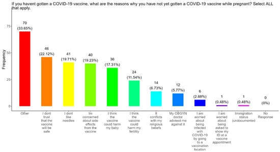 When participants were asked why they did not received the COVID-19 vaccine, the majority (22.1%) responded that they did not trust that the vaccines were safe, followed in order by needle phobias (19.7%), concerns about side effects (19.2%), concerns that the vaccine could harm their baby (17.3%), concerns that the vaccine could harm their fertility (11.5%), conflicts with religious beliefs (6.7%), received advice against it by a doctor (5.8%), concerns about being infected with COVID at a vaccination location (2.9%), concerns about showing an ID at a vaccine appointment (0.48%), and concerns about their immigration status being undocumented (0.48%) (Figure 9). The remainder of participants had other reasons for not receiving the COVID-19 vaccine (33.7%) (Figure 9).