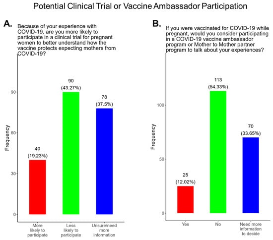 Participants were also asked if they were likely to participate in clinical trials for pregnant women to better understand how the COVID-19 vaccine protects expecting mothers from COVID-19 disease. Most participants (43.3%) responded that they were less likely to participate in a COVID-19 clinical trial, and only 19.2% of participants said that they were more likely to participate in a pregnancy related COVID-19 clinical trial (Figure 11A). The remainder of participants were either unsure or needed more information to decide (Figure 11A). We also asked participants if they would be willing to participate in a COVID-19 ambassador program or Mother To Mother partner program to discuss their experiences with COVID-19 as expecting mothers (Figure 11B). Most participants (54.3%) declined participation in ambassador programs, and only 12.0% were willing to participate (Figure 11B). The remainder of participants (33.7%) needed more information to decide (Figure 11B).
