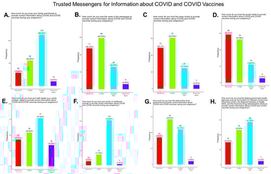 Receiving evidence-based information about COVID-19 is essential for expecting mothers to make critical decisions about their health and the health of their babies. We asked the participants which entity they considered to be a reliable source of COVID-19 information based on the options we provided. The participants were also asked to identify their most trusted messengers when needing information about COVID-19 and COVID-19 vaccines. The messengers included family and friends, news and newspapers, online news, social media, faith leaders, primary care providers, local and state governments, and federal government health agencies (CDC, FDA, NIH) (Figure 12). Briefly, for friends and family, 81.3% responded that they were “a great deal” or “a little” reliable sources of COVID information, while 13.94% responded “not at all” and 4.8% responded as “not applicable” (Figure 12A). For news and newspapers, 61.6% responded that they were “a great deal” or “a little” reliable sources of COVID information, while 34.1% responded “not at all” and 4.3% responded as “not applicable” (Figure 12B). For online news, 61.6% of participants responded that they were “a great deal” or “a little” reliable sources of COVID information, while 35.1% responded “not at all” and 3.4% responded as “not applicable” (Figure 12C). For social media, 53.9% responded that they were “a great deal” or “a little” reliable sources of COVID information, while 42.3% responded “not at all” and 3.9% responded as “not applicable” (Figure 12D). For faith leaders, 63.0% responded that they were “a great deal” or “a little” reliable sources of COVID information, while 20.7% responded “not at all” and 16.4% responded as “not applicable” (Figure 12E). For primary care physicians, 91.4% responded that they were “a great deal” or “a little” reliable sources of COVID information, while 6.7% responded “not at all” and 1.9% responded as “not applicable” (Figure 12F). For state and local governments, 72.6% responded that they were “a great deal” or “a little” reliable sources of COVID information, while 24.5% responded “not at all” and 2.9% responded as “not applicable” (Figure 12G). For federal government health agencies, 75.1% responded that they were “a great deal” or “a little” reliable sources of COVID information, while 21.6% responded “not at all” and 3.4% responded as “not applicable” (Figure 12H). Overall, the results show that most participants preferred primary care physicians a little or a great deal as the most reliable sources of information about COVID-19 and COVID-19 vaccines among all of the options presented to the participants (Figure 12F).
