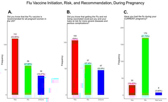 Flu vaccine uptake among pregnant women in the United States have declined following the COVID-19 pandemic to approximately 38% in March 2025, in contrast to 57.5% flu vaccine coverage among pregnant women during the 2019–2020 flu season [41]. In our study, when participants were asked if the flu vaccine is recommended for all pregnant women in the USA, 53.9% responded yes, 27% responded no, and 18.2% were unsure if they received a flu vaccine during their current pregnancy (Figure 13A). When participants were asked if they knew that receiving the flu and being unvaccinated could lead to severe disease for them and their baby, 50% said yes, 27.4% declined the vaccine, and 22.6% were unsure if they received the flu vaccine (Figure 13B). Having the flu during pregnancy can result in severe complications that can be life-threatening for mothers and their babies. When participants were asked if they contracted flu during their current pregnancy, 14.4% responded yes, 81.7% responded no, and 3.9% of participants were unsure if they had contracted flu during their current pregnancy (Figure 13C).