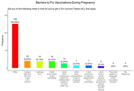When participants were asked what were the barriers to receiving a flu vaccine during pregnancy, the majority (9.6%) responded that they could not take time from work to receive a vaccine, (9.1%) could not afford the vaccine, (9.1%), did not know where to receive vaccinated, (6.3%) were concerned about child care, (3.4%) did not have transportation to the vaccination location, (3.4%) did not know how to make an appointment, and (2.4%) were concerned about not having a social security number or government ID, and there were no concerns about language (Figure 16). The remainder of participants had barriers that were different from the options proposed (60.6%) (Figure 16).