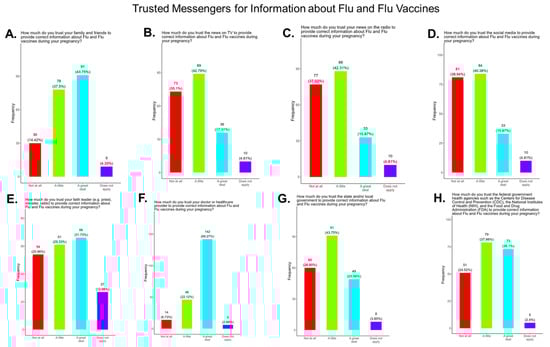 We asked participants to identify their most trusted messengers when needing information about flu and flu vaccines. The messengers included family and friends, news and newspapers, online news, social media, faith leaders, primary care providers, local and state governments, and federal government health agencies (CDC, FDA, NIH) (Figure 17). Briefly, for friends and family, 81.3% responded that they were “a great deal” or “a little” reliable sources for flu information, while 4.4% responded “not at all” and 4.3% responded as “not applicable” (Figure 17A). For news and newspapers, 60.1% responded that they were “a great deal” or “a little” reliable sources of flu information, while 35.1% responded “not at all” and 4.8% responded as “not applicable” (Figure 17B). For news online, 58.3.1% responded that they were “a great deal” or “a little” reliable sources of flu information, while 36.5% responded “not at all” and 5.3% responded as “not applicable” (Figure 17C). For social media, 56.3% responded that they were “a great deal” or “a little” reliable sources for flu information, while 39.0% responded “not at all” and 4.8% responded as “not applicable” (Figure 17D). For faith leaders, 61.0% responded that they were “a great deal” or “a little” reliable sources of flu information, while 26.0% responded “not at” all and 13.0% responded as “not applicable” (Figure 17E). For primary care physicians, 90.4% responded that they were “a great deal” or “a little” reliable sources of flu information, while 6.7% responded “not at all” and 2.9% responded as “not applicable” (Figure 17F). For state and local governments, 67.4% responded that they were “a great deal” or “a little” reliable sources of flu information, while 28.9% responded “not at all” and 3.9% responded as “not applicable” (Figure 17G). For federal government health agencies, 73.1% responded that they were “a great deal” or “a little” reliable sources of flu information, while 24.5% responded “not at all” and 2.4% responded as “not applicable” (Figure 17H).