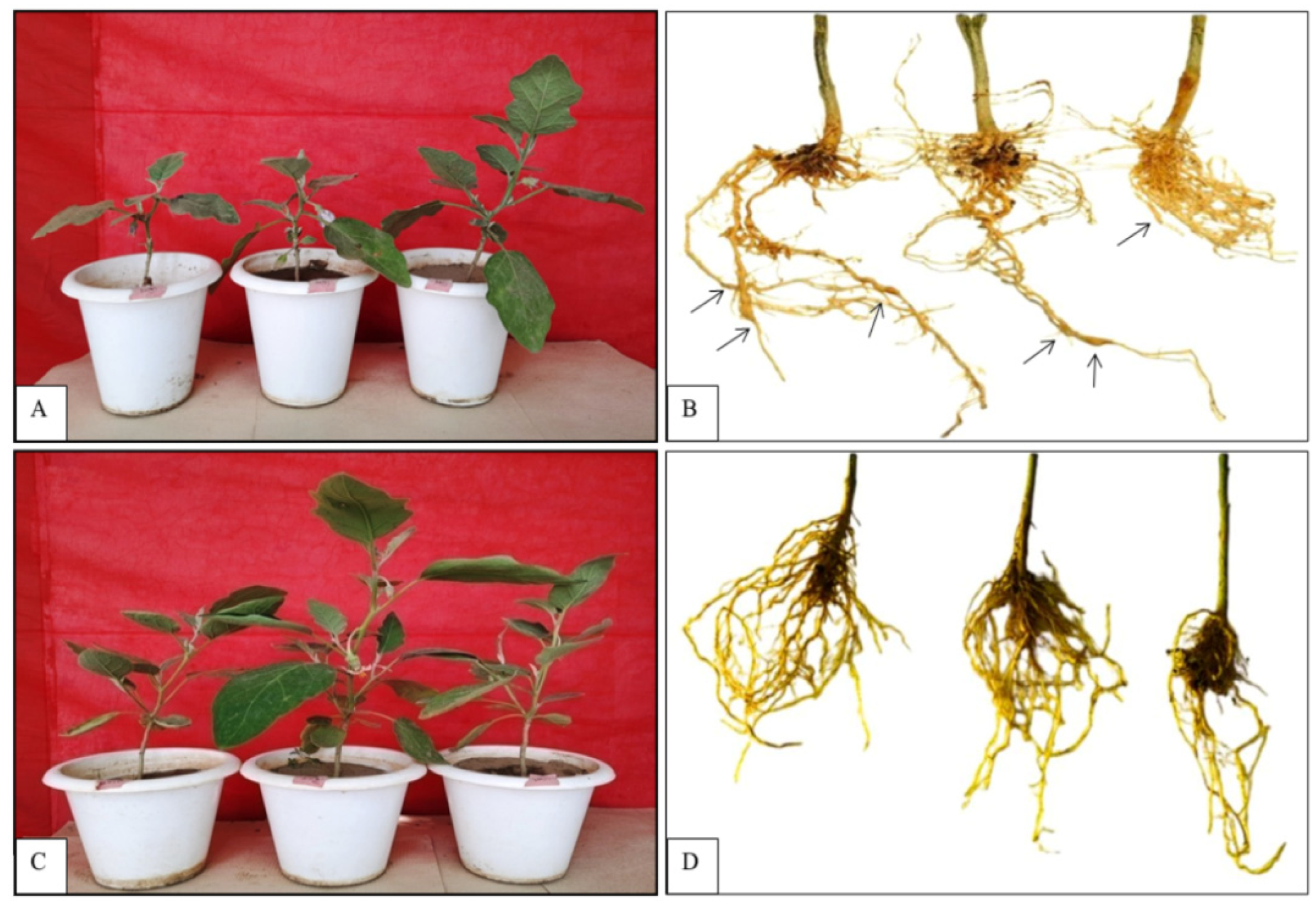 - Das, S.; Wadud, M.A.; Chakraborty, S.; Khokon, M.A.R. Biorational management of root-knot of brinjal (Solanum melongena L.) caused by Meloidogyne javanica. Heliyon 2022, 8, e09227. [Google Scholar] [CrossRef]