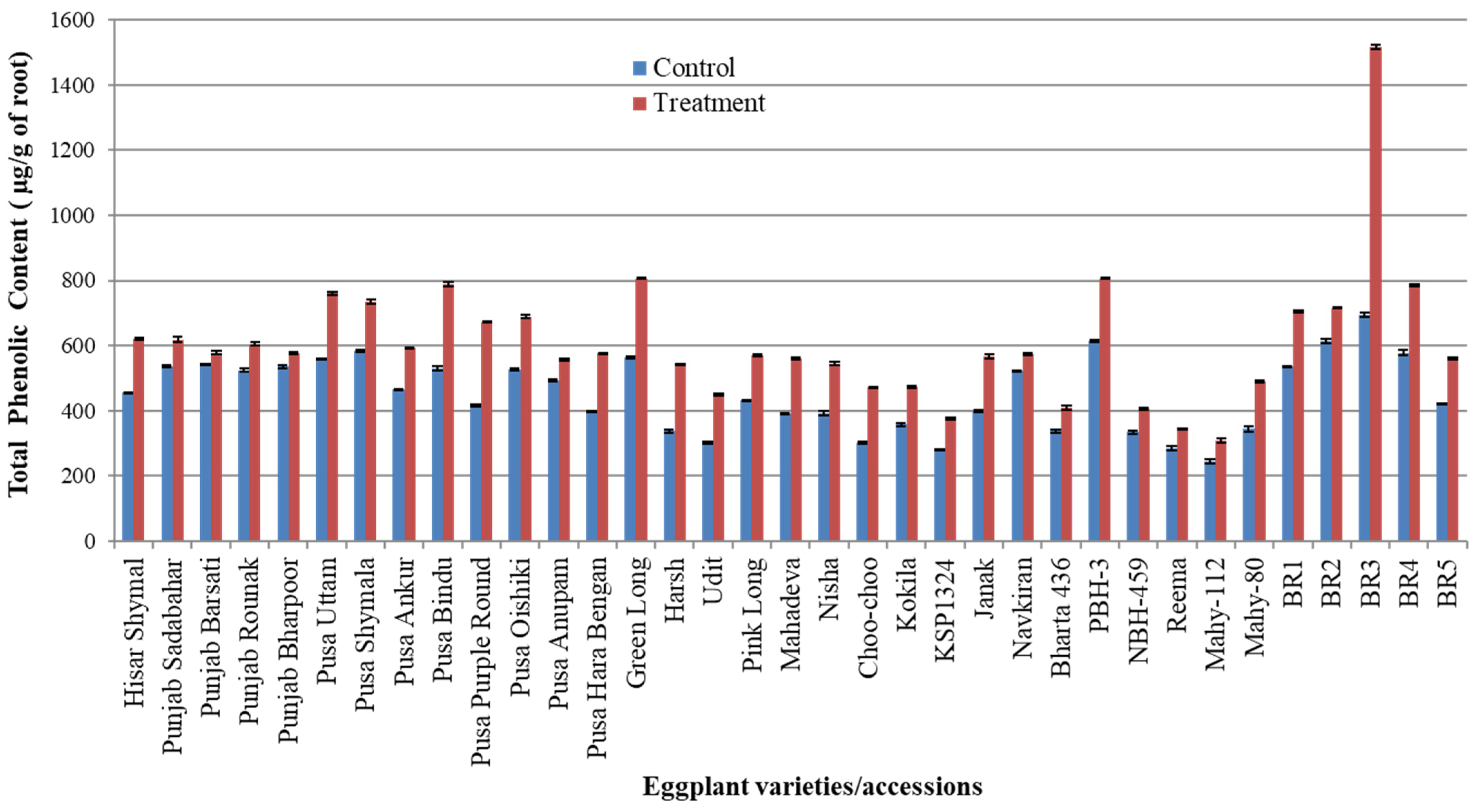 | S. No. | Varieties/Accessions of Eggplant | TPC µg/g of Root in Uninfected Eggplant | TPC µg/g of Root in RKN-Infected Eggplant |